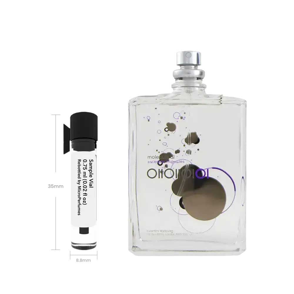 Molecule 01 (Eau de Toilette) by Escentric Molecules is a fragrance for men and women. introduced in 2006. It opens with subtle. woody notes. moves to soft. musky tones. and settles on velvety. warm accords for a minimalist. intimate signature. This avant-garde scent adapts to the wearer’s skin chemistry. making it ideal for any season and occasion. from daily wear to special events. Our 0.75 ml sample vial gives you enough fragrance for several wears. making it a low-risk way to explore a scent without commitment.
