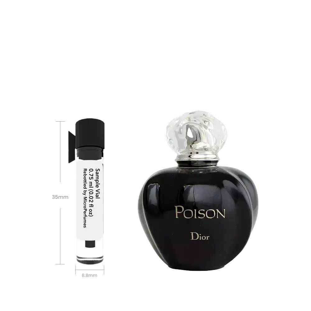 Poison (Eau de Toilette) by Christian Dior is a fragrance for women. introduced in 1985. It opens with spicy and fruity notes. moves to floral and resinous accords. and settles on warm and woody tones for a bold. mysterious. and seductive signature. This iconic scent is perfect for evening wear. enveloping you in an aura of intrigue and allure. Our 0.75 ml sample vial gives you enough fragrance for several wears. making it a low-risk way to explore a scent without commitment.