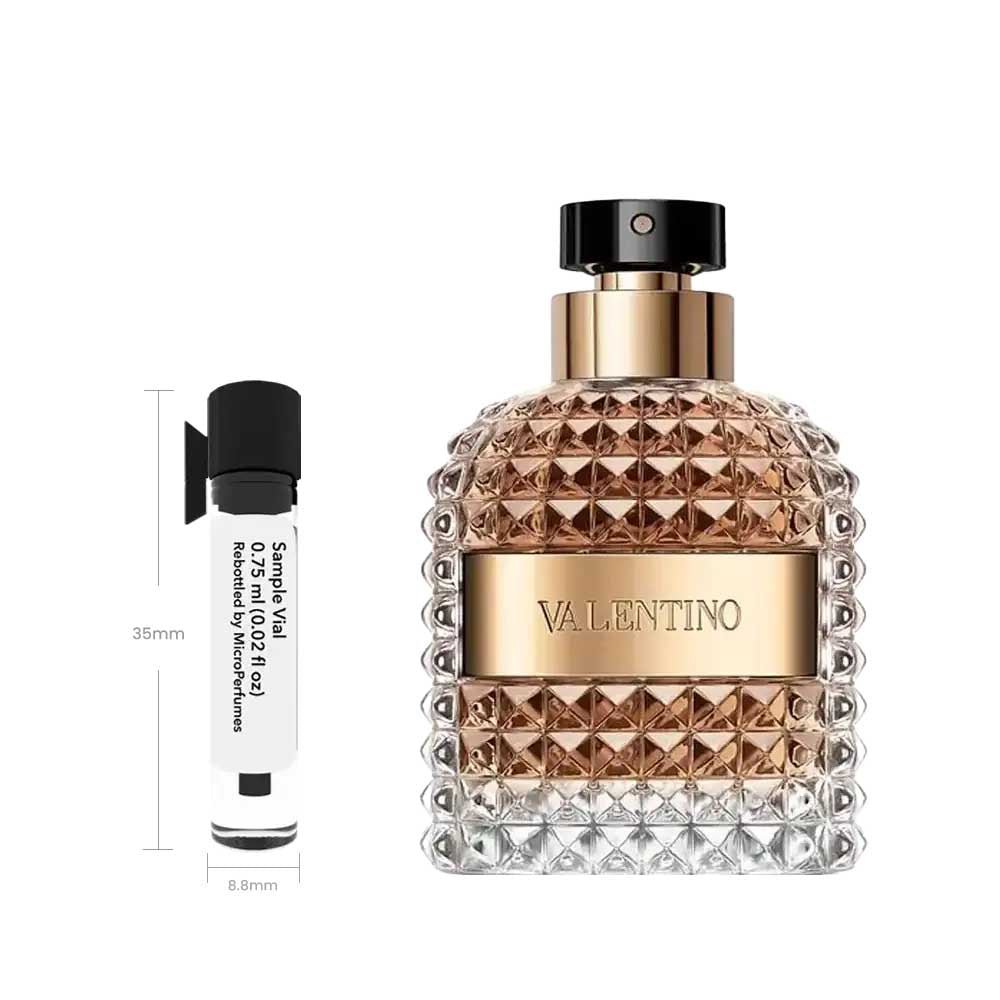 Uomo (Eau de Toilette) by Valentino is a fragrance for men. introduced in 2014. It opens with fresh. citrusy notes. moves to earthy. floral tones. and settles on warm. spicy accords for a refined. sophisticated signature. Ideal for cooler seasons and evening events. this scent exudes elegance and depth. making it a perfect choice for formal occasions and intimate gatherings. Our 0.75 ml sample vial gives you enough fragrance for several wears. making it a low-risk way to explore a scent without commitment.
